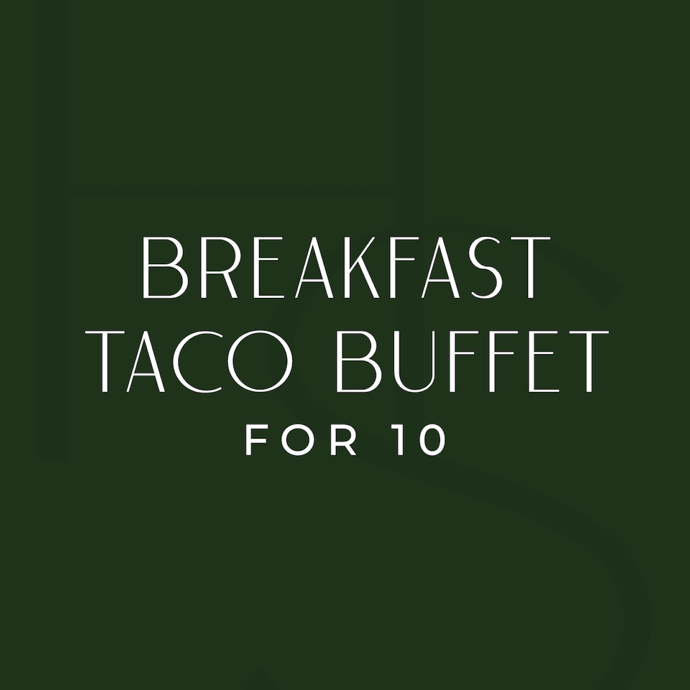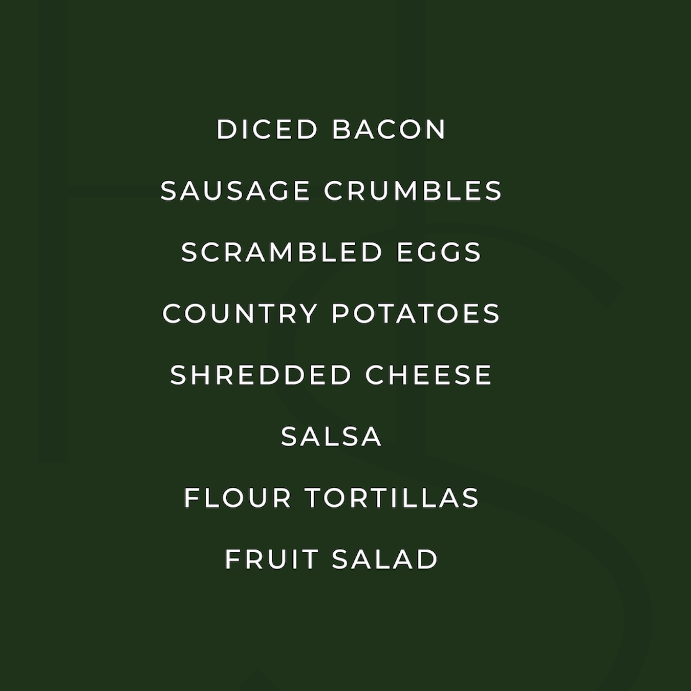 This disposable drop-off Breakfast Taco Buffet will include diced bacon, sausage crumbles, scrambled eggs, country potatoes, shredded cheese, salsa, flour tortillas, and fruit salad.