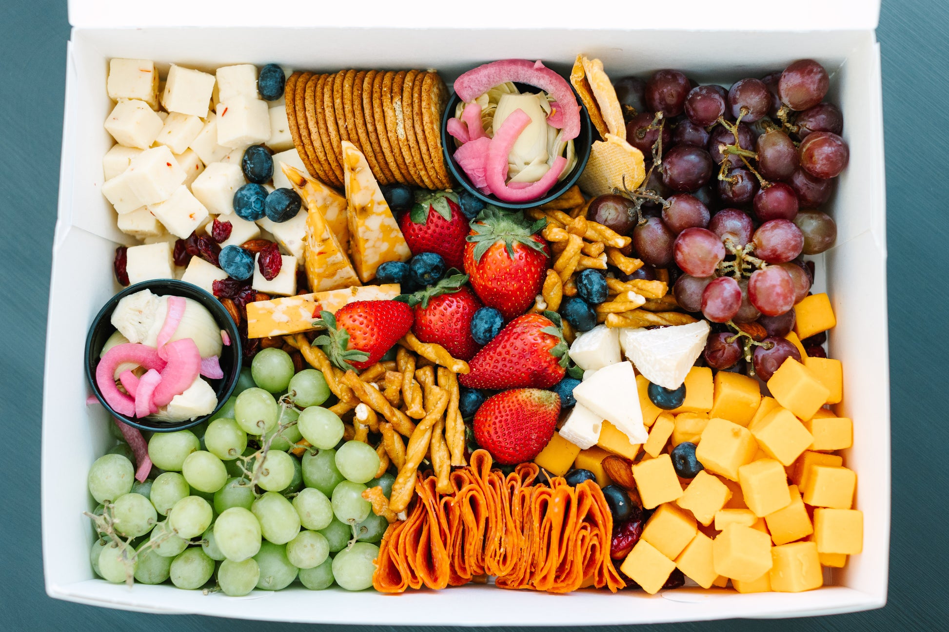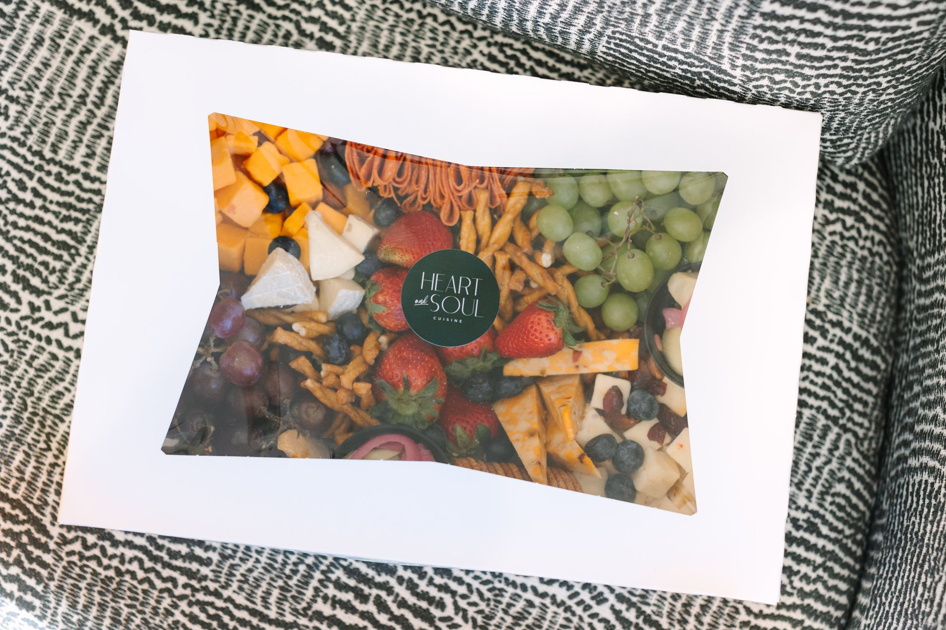 A beautifully designed board with fresh fruits & veggies, hummus, dried fruits, chocolate bark, assorted nuts, artisan meats & cheeses, and assorted crackers.